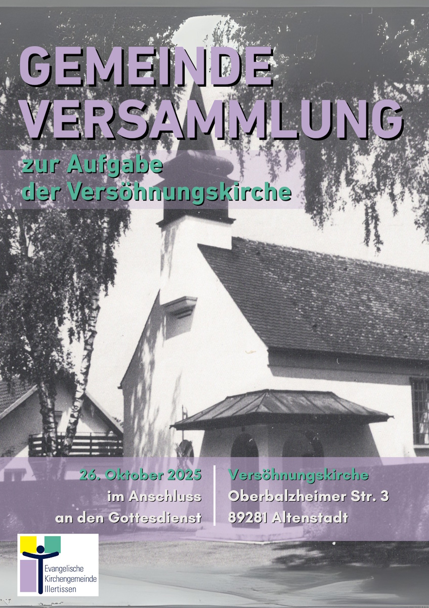 Der Kirchenvorstand der Evang.-Luth. Kirchengemeinde Illertissen hat beschlossen, die Versöhnungskirche in Altenstadt zu verkaufen. Am Sonntag, dem 26. Oktober 2025, findet im Anschluss an den Gottesdienst eine Gemeindeversammlung in der Versöhnungskirche statt, in der ausführlich über die Hintergründe und den aktuellen Stand der Pläne berichtet wird.