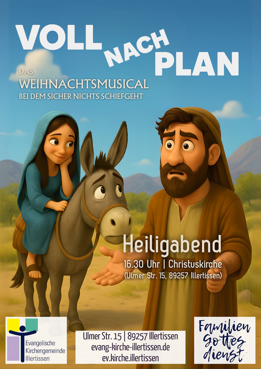 Am 24.12. feiern wir um 16.30 Uhr Familiengottesdienst in der Christuskirche (Ulmer Str. 15, 89257 Illertissen). Im Gottesdienst führen Kinder das Musical “Voll nach Plan” auf.