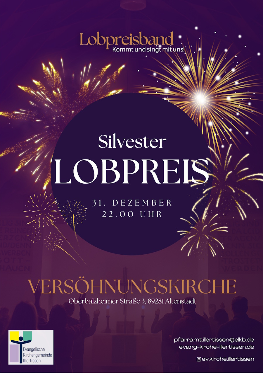 Herzliche Einladung zum Silvester-Lobpreis am 31. Dezember 2025 um 22.00 Uhr in der Versöhnungskirche in Altenstadt (Oberbalzheimer Straße 3, 89281 Altenstadt).