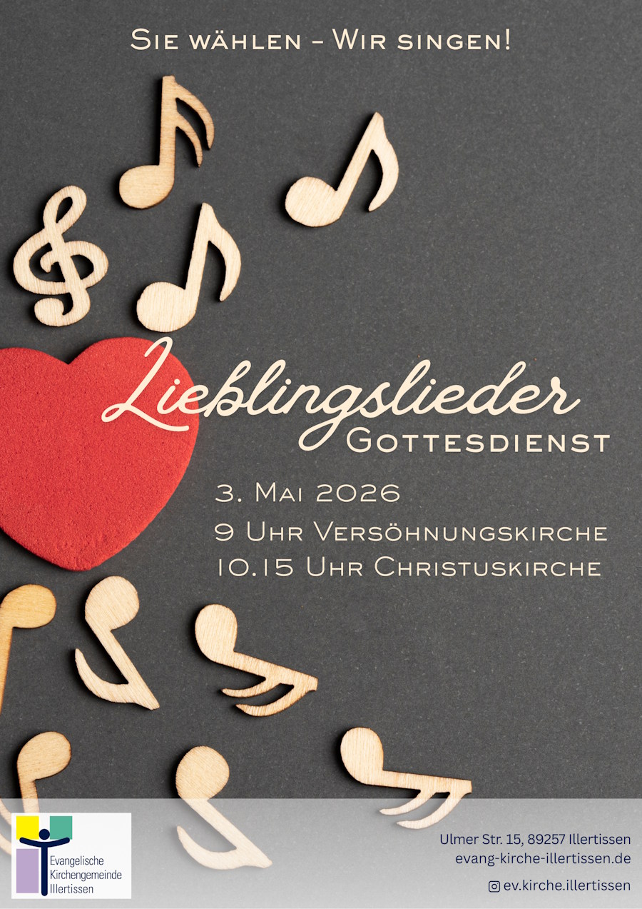 Am Sonntag, 3. Mai 2026, laden wir Sie herzlich zum Lieblingslieder-Gottesdienst ein – ein Gottesdienst, bei dem Sie entscheiden, was gesungen wird! So funktioniert’s: Ab 1. April liegen in unserer Versöhnungskirche und unserer Christuskirche Zettel aus. Schreiben Sie einfach Ihr Lieblingslied aus dem Evangelischen Gesangbuch darauf – ob Trostlied, Danklied, Tauferinnerungslied, Abendmahlslied oder Abendlied. Alle...