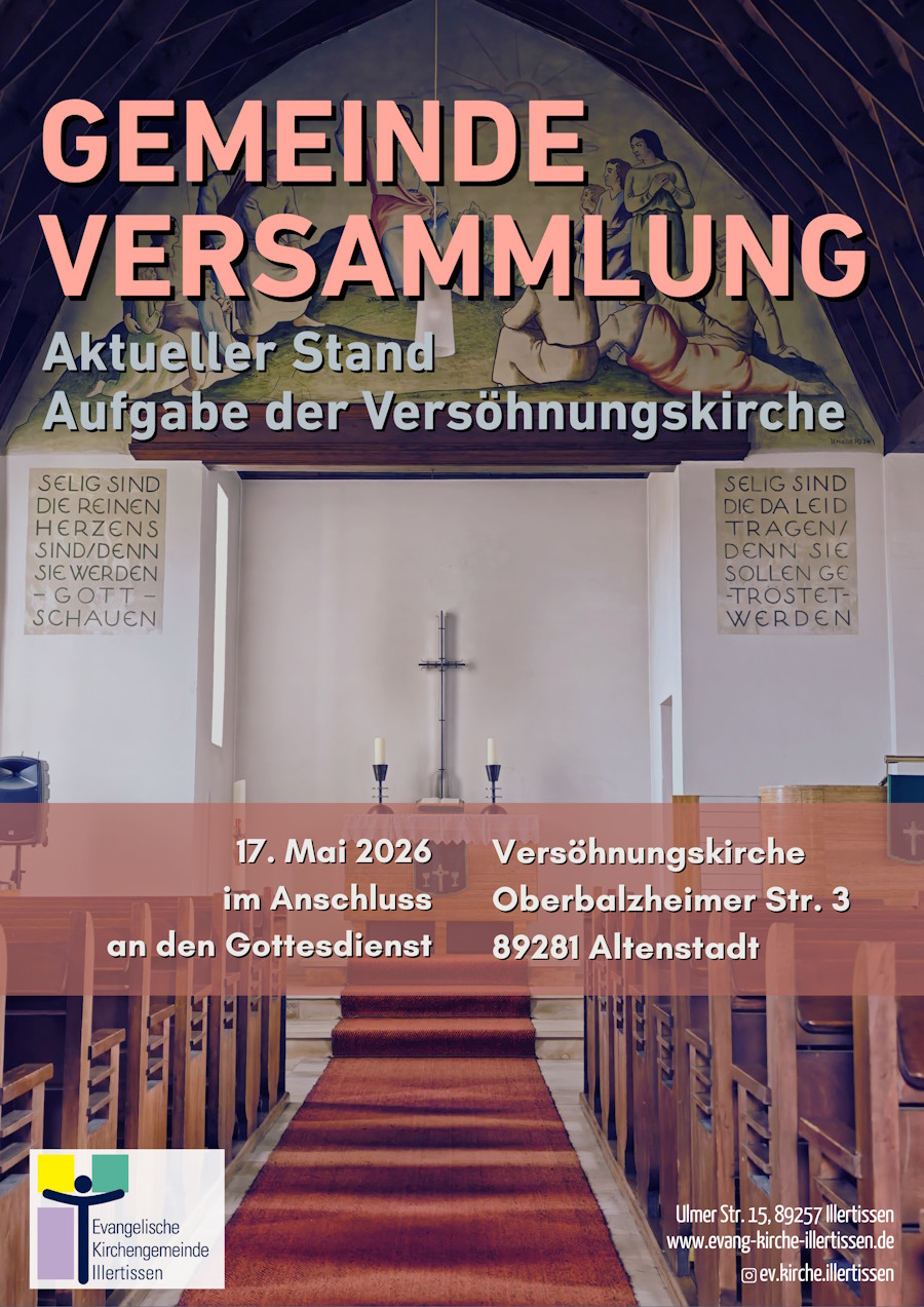 Am 31. Dezember 2026 werden die Gottesdienste in der Versöhnungskirche in Altenstadt eingestellt. Das Gebäude soll verkauft werden. Am Sonntag, 17. Mai 2026, laden wir im Anschluss an den Gottesdienst zur nächsten Gemeindeversammlung in die Versöhnungskirche ein. Bei der Gemeindeversammlung informieren wir über den aktuellen Stand und wollen mit den Gemeindegliedern ins Gespräch kommen, ob...