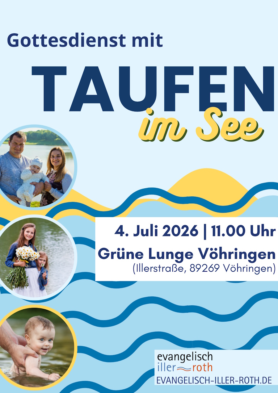 Am Samstag, dem 4. Juli 2026, um 11:00 Uhr, laden wir zu einer ganz besonderen Taufe ein. Wir feiern einen Gottesdienst inmitten der Natur, an der Grünen Lunge in Vöhringen, und taufen direkt im Wasser des Sees. Rund um das Ufer breiten wir unsere Picknick-Decken aus, genießen die Atmosphäre am Wasser und feiern einen lebendigen...
