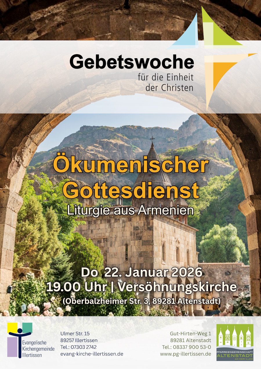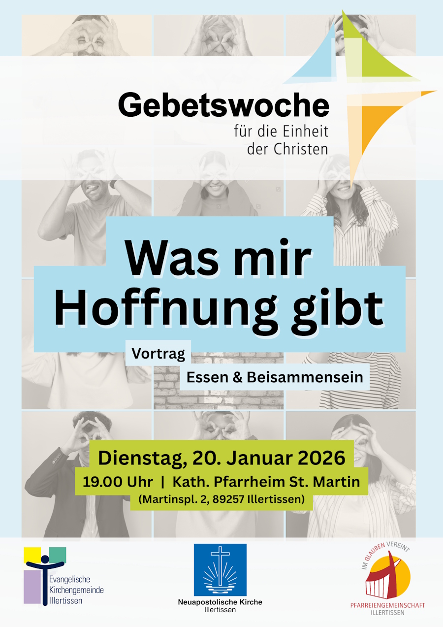 Unsere Welt scheint manchmal immer verrückter zu werden. Viele Menschen verlieren dabei den Mut. Doch wir Christen tragen eine Hoffnung in uns – ganz gleich, wie schwierig die Zeiten auch sein mögen. Im Rahmen der Ökumenischen Gebetswoche für die Einheit der Christen laden die Neuapostolische Kirche Illertissen, die katholische Pfarreiengemeinschaft Illertissen und die Evangelische Kirchengemeinde...