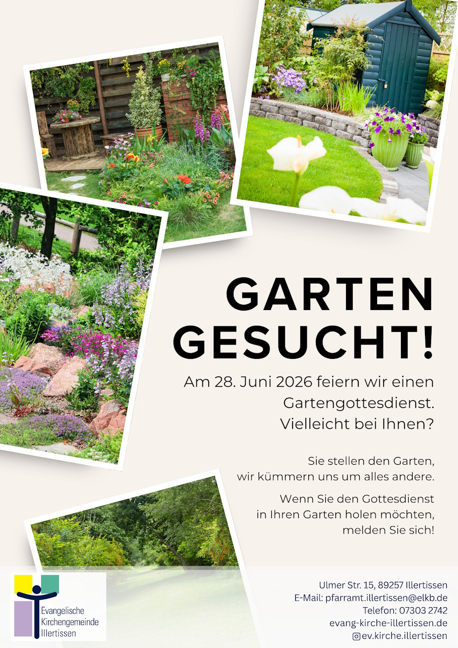 Sie haben die Möglichkeit, den Sonntagsgottesdienst zu sich nach Hause zu holen! Am Sonntag, dem 28. Juni 2026, feiern wir einen Gartengottesdienst. Vielleicht ja bei Ihnen. Sie stellen uns Ihren Garten zur Verfügung, wir kümmern uns um alles andere (Bestuhlung, Altar, Musik usw.). Ihr Garten sollte Platz für zehn Bierbänke einen Tisch bieten. Wenn Sie...