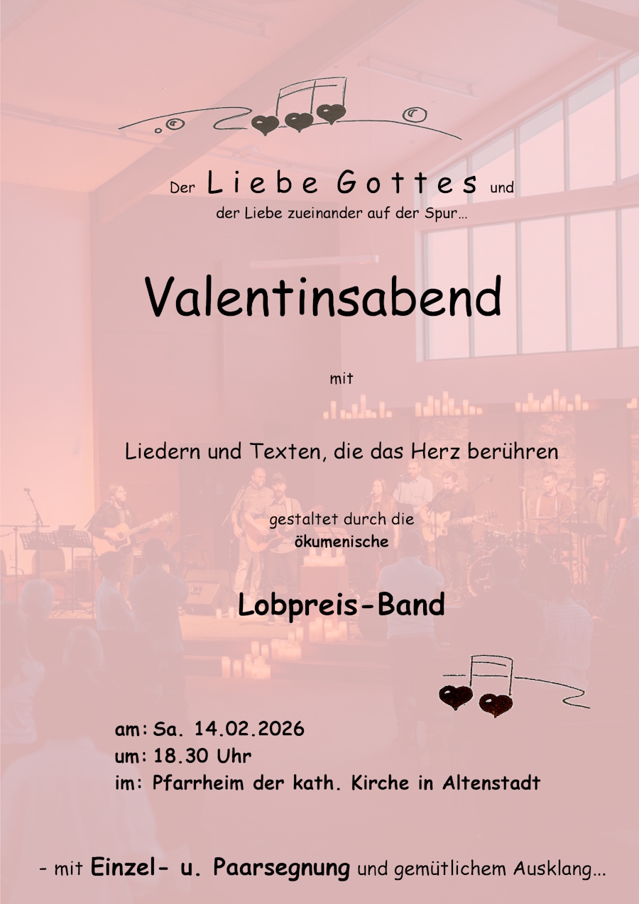 Am Valentinstag lädt die Ökumenische Lobpreisband alle Paare und Interessierten ein, mit Liedern und Texten die Liebe Gottes und die Liebe zueinander zu ergründen. Während des Lobpreises können sich Paare oder Einzelpersonen persönlich segnen lassen. Datum: Samstag, 14.02.2026 Uhrzeit: 18:30 Uhr Ort: Kath. Pfarrheim »Zum Guten Hirten« (Gut-Hirten-Weg 3, 89281 Altenstadt)