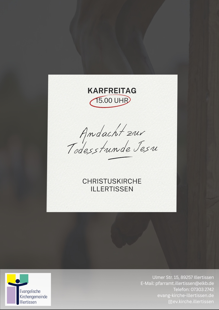 Am Karfreitag, dem 3. April, laden wir zur Andacht zur Sterbestunde Jesu ein. Zur Stunde seines Todes, um 15.00 Uhr, versammeln wir uns in der Christuskirche. Wir hören die vollständige Passionsgeschichte nach Lukas, beten, singen Passionslieder und denken an das Sterben unseres Heilands – sowie daran, was es bedeutet. Sein Tod ist nicht einfach ein...